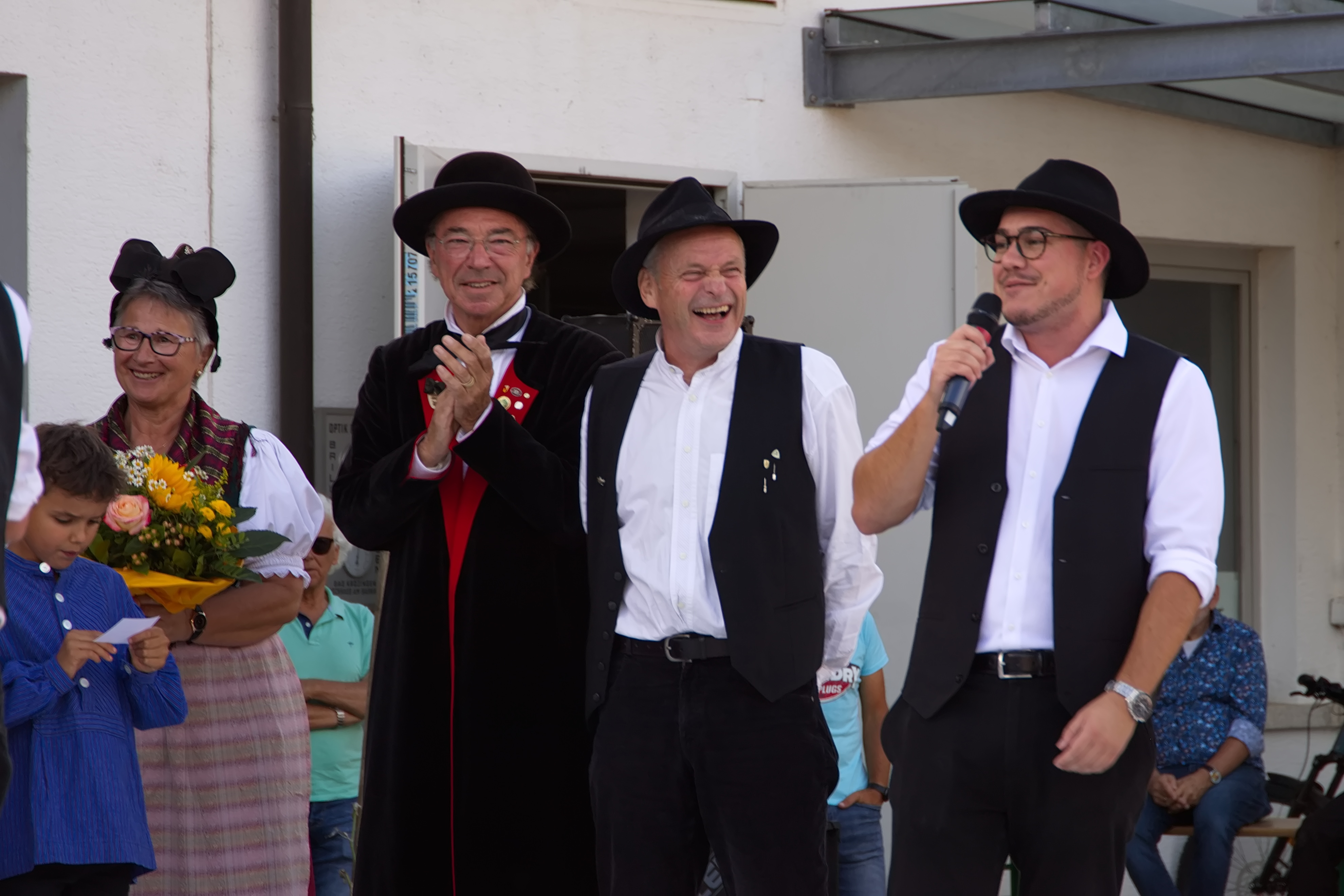 Hans-Peter Sütterle ist jetzt 11 Jahre im Verein und davon 10 Jahre erster Vorstand. Mathias Bösch bedankt sich herzlich für sein Engagement in diesem Amt. Hans-Peter ist in diesen zehn Jahren auch in schweren Zeiten an seinem Amt gewachsen. Bemerkenswert ist, dass wir trotz Corona keinen Schwund hatten. Es gibt nur 5 Vorstände, die länger im Amt waren seit 1905. Otto Bösch, der erste in den Vereinschroniken namentlich erwähnte erste Vorstand war 18 Jahre von 1905-1923 im Amt. Ähnliche Ausdauer bewies Gustav Gutgsell. Erwin Kotterer war von 1959-71 zweiter und danach erster Vorstand. Mathias bedankt sich ganz herzlich im Namen des Vereins und überreicht Hans-Peter ein kleines Dankeschön in Form eines Präsentkorbes.